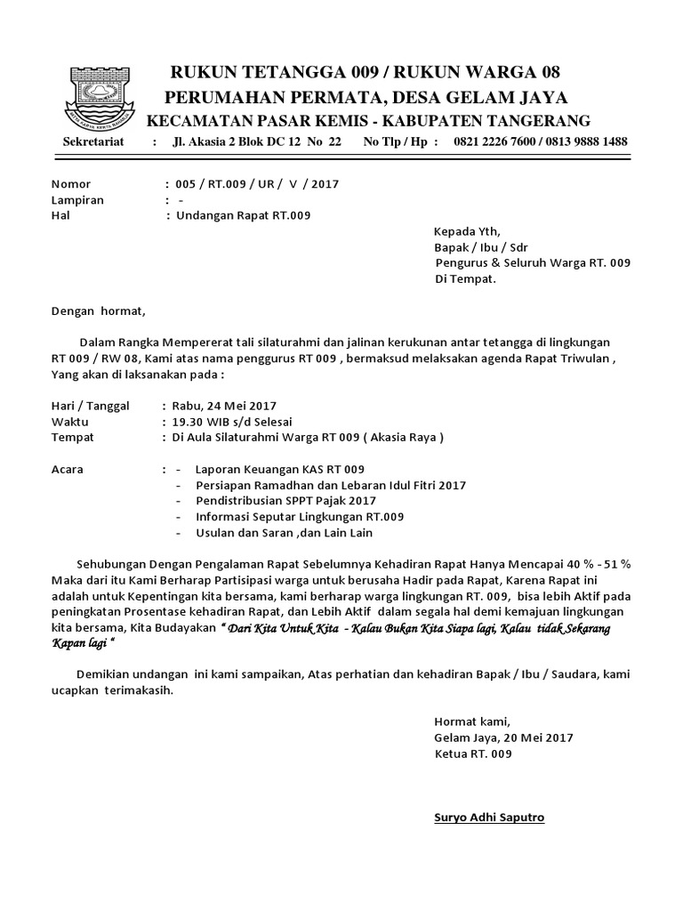 Sehingga, sudah pasti dibutuhkan rapat untuk membahas hal ketua rt 009/07. Sebuah perusahaan tentu akan sangat ketat dalam menjalankan administrasi. Contoh surat undangan rapat perusahaan. Ada berbagai contoh surat undangan dengan berbagai jenis kegiatan seperti surat undangan rapat, pernikahan, reuni, dan sebagainya. Contoh surat undangan rapat warga dilingkup rt dan rw.